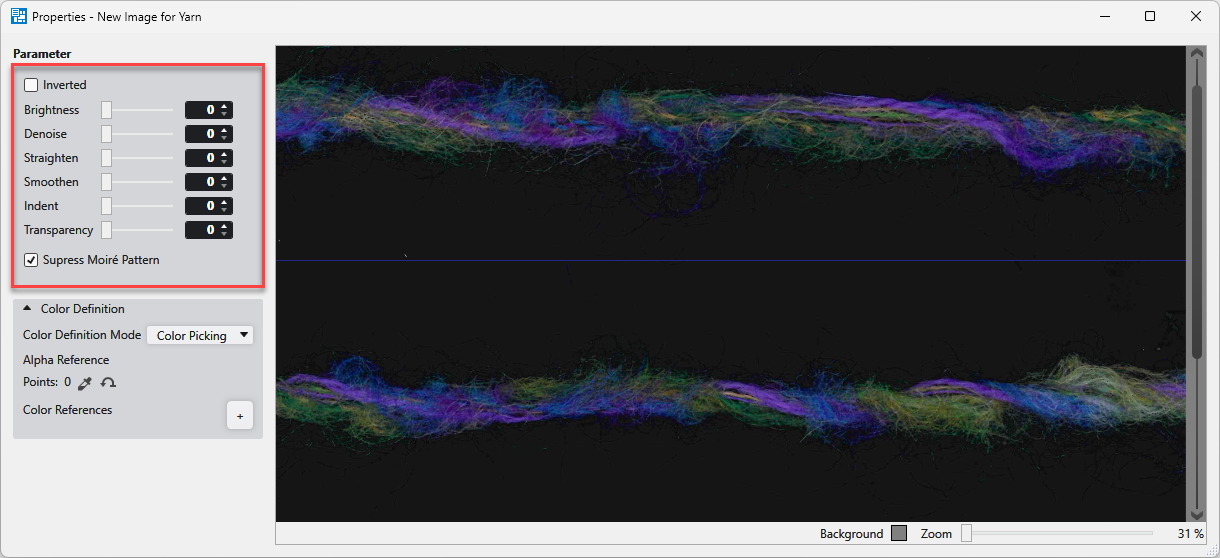 In the Parameter dialog box you make the following settings for the image of the scanned yarn: