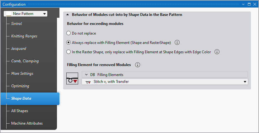 Select a knitting element to fill the vacant needle positions. Only select modules of size 1x1