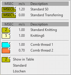 In the 2nd row of the table header, open the context menu containing the default settings with RMB. - The context menu for the 速度 (MSEC) appears.