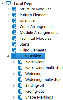 directory contains all the knitting elements for fully fashion with their corresponding properties. - There are further subdirectories for a better structuring.
