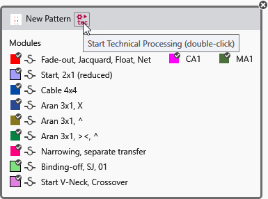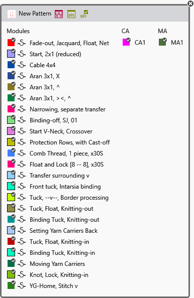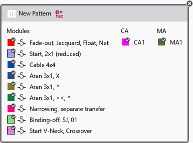 Opens a dialog box where all modules, CAs and MAs that are used in the pattern are displayed. It is opened with a double-click on a knitting element.