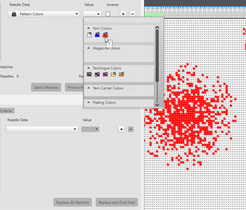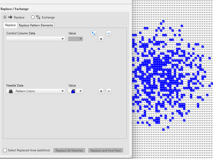 - Under 替换 / 交换 / 织针数据, select the pattern colors and under 值, select the yarn color blue.
