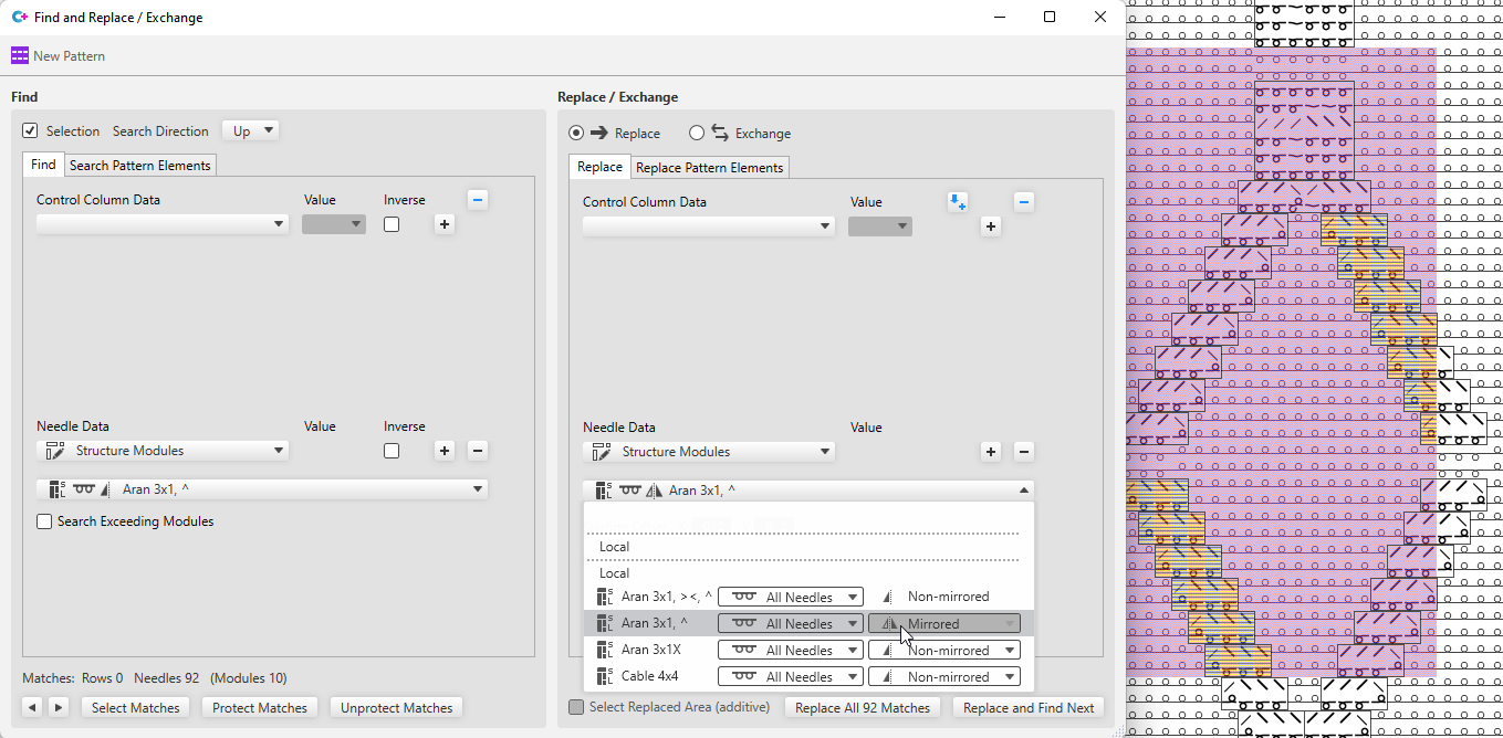 结构模块 and under that select any module that is to be searched for. - Under 替换 / 交换 / 织针数据 select the structure module that is to be inserted.