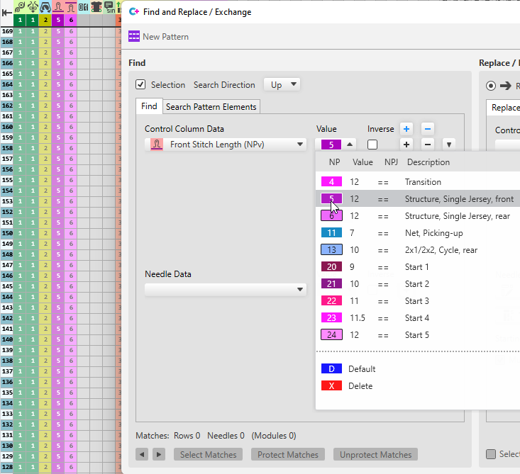 (e.g. Front Stitch Length, value: NP5) - Under 替换 / 交换 / 控制列数据, select the control column and the 值 that is to be entered.