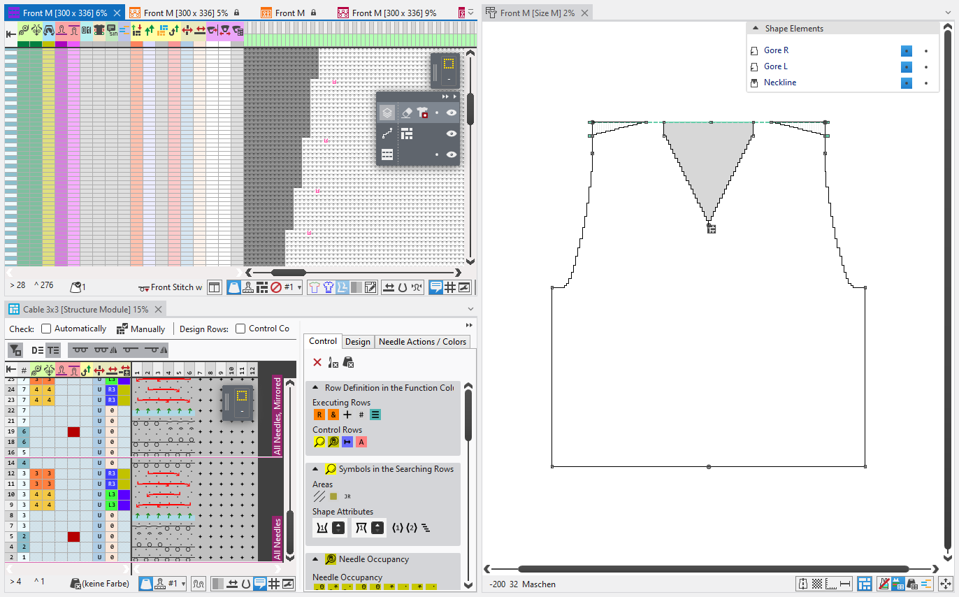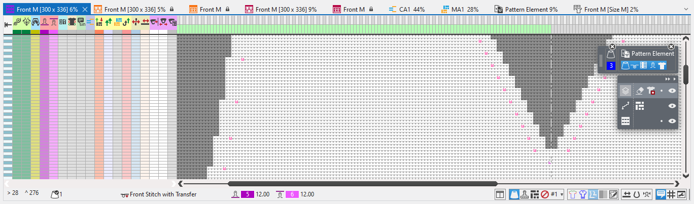 Knitting elements have specific tool windows inside of the document in addition to the status bar.