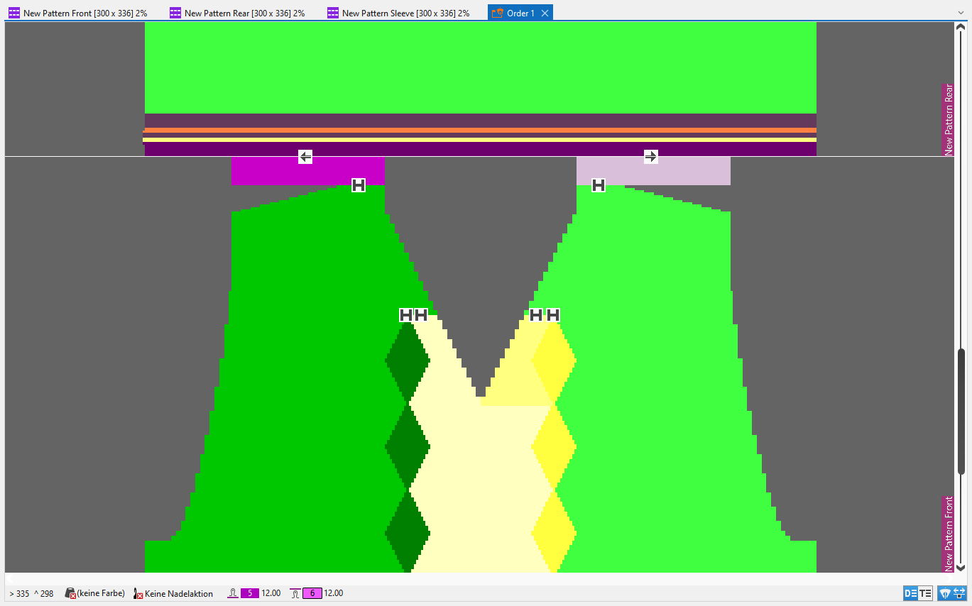 When clicking on an color field in a pattern it is highlighted with a diagonal grid. Other areas from all patterns of the order where the same yarn carrier is used, are highlighted with diagonal lines.