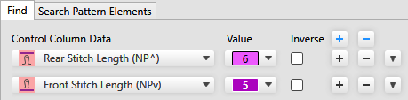 If the stitch length is selected in the control columns data, then the entry is found in the control column with Find and Replace. |