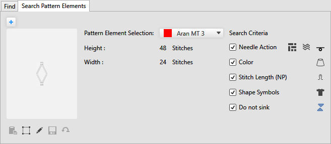 Search for knitting elements, Jacquards or needle actions of the selected pattern element. |
