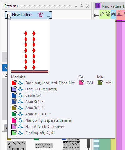 In the tool tip of the pattern name appears a preview of the pattern and a list of the modules, CAs and MAs that are applied in this pattern.