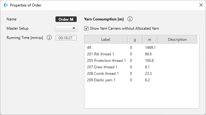 显示这个编织程序所有导纱器的耗纱量。 值只在 Sintral 检验之后才可用。 纱线长度 [m] 也许会不同于 Sintral 检验值,因为 Sintral 检验仅显示各个导纱器的单个纱线长度。 在“纱线定义”和“纱线分配”工具窗口中定义和分配的纱线也显示单位为克的耗纱量。