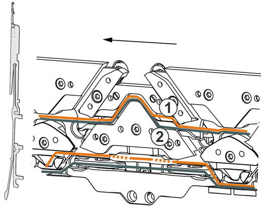 Der Motivfaden wird, zusätzlich zum Bindefaden, in ausgewählte Nadeln eingelegt.