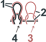 Die einflächige Grundbindung ("R-L") wird mit allen Nadeln durch den Bindefaden gebildet.