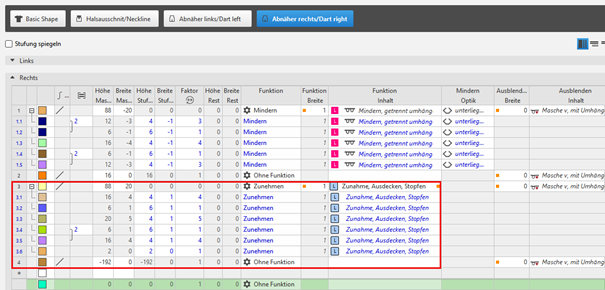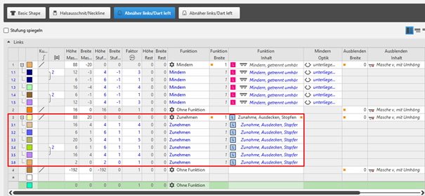 - Stufenbreite beim Mindern / Zunahme: 1 Nadel