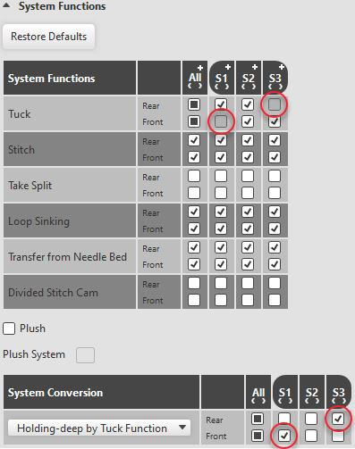 Durch den Systemumbau kann der Schussfaden im Kammspalt verriegelt werden bis eine nachfolgende Maschenreihe gestrickt wurde. - An den Farbfeldrändern bei Intarsia tritt das Problem auf, dass der Faden, der vom Fadenführer ins Farbfeld zurückgeht so hoch liegt, dass er nicht von der ersten Nadel des Farbfeldes erfasst wird.