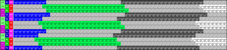 Symbol-Ansicht nach Technik-Bearbeitung anzeigen. - Die Fadenführer werden nach den eingestellten Vorgaben und den Intarsia-Regeln (konstruktive Gegebenheiten der I-Fadenführer auf der Maschine) automatisch zusammengefasst.