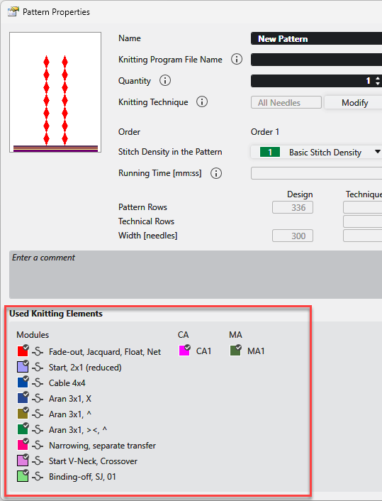 Im Dialog Muster-Eigenschaften werden die im Muster angewendeten Strickelemente angezeigt.