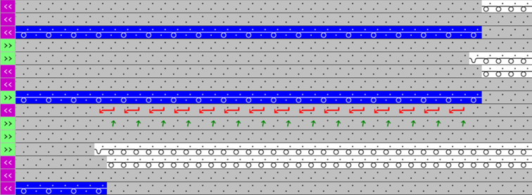 . - Die Fadenführer werden nach den eingestellten Vorgaben und den Intarsia-Regeln (konstruktive Gegebenheiten der I-Fadenführer auf der Maschine) automatisch zusammengefasst.