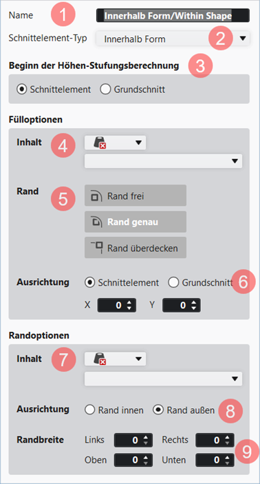 9 | Randbreite | Eingabe der gewünschten Randbreite am Rand des Schnittelements nach links, rechts, oben und unten | ||||