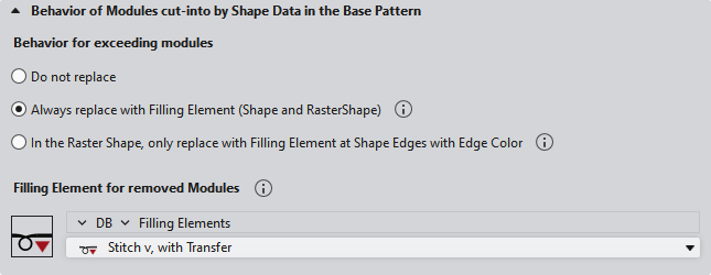 | Die angeschnittenen Module werden nur in der Rasterform an Formkanten mit Kantenfarbe durch das ausgewählte Füllelement ersetzt.