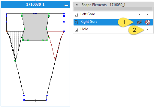 Mit dem Bedienelement Schnittelemente steuern Sie die Auswahl und Anzeige der Schnittelemente im Strickteil.