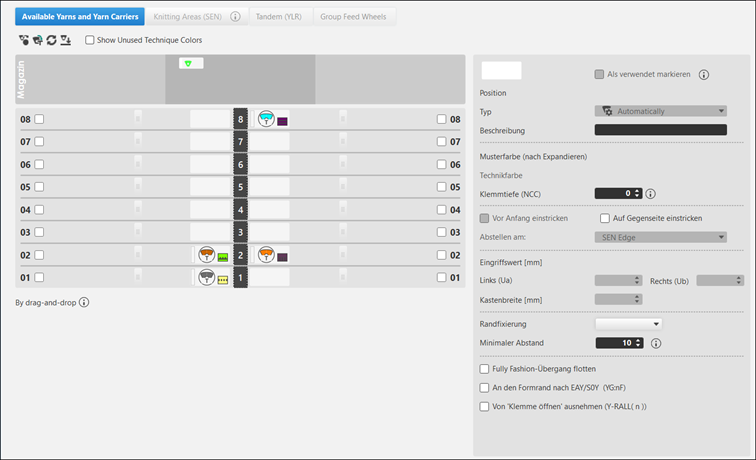 In the Yarn Carriers tool window, you can indicate the desired specifications regarding the yarn carriers and influence the yarn carrier home position.