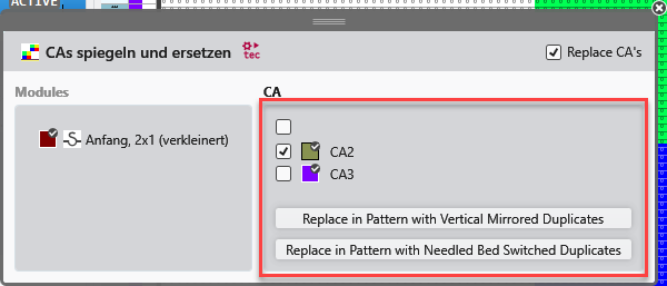 The reflection variants Mirror on Vertically Axis and Switch Needle Beds can be created and replaced for an entire pattern and for several CA.