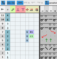 - In the drawing canvas, in the technical rows, draw the desired structure with knitting and e.g. transfer needle actions.