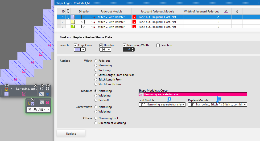 The direction is important for modules greater 1x1 used for fading-out. - In the Shape Markings tool window, you create, edit and select for drawing, the shape markings and their knitting technique, their anchor points and distances.