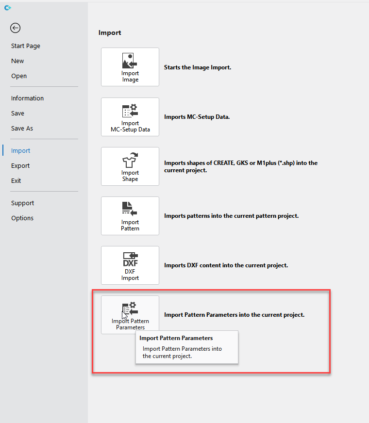 - Click the Import Pattern Parameters function on the Import section of the backstage view.