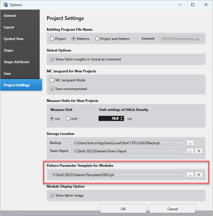 - Load the desired template in the Pattern Parameter Template for Modules section of the Project Settings tab.