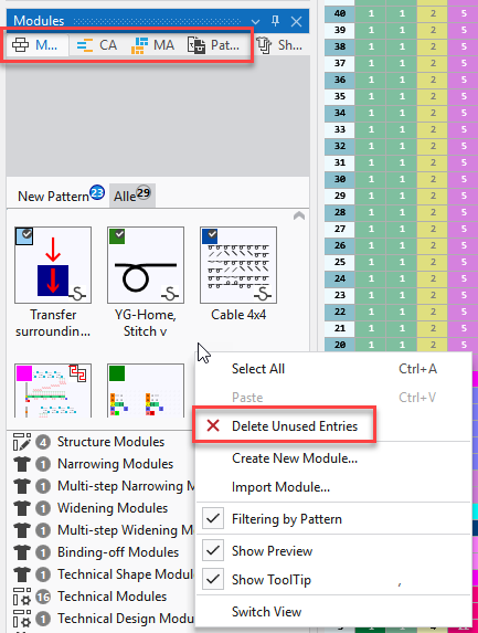 Delete Unused Entries function in the context menu of the tool windows Modules, CA, MA and Pattern Elements.