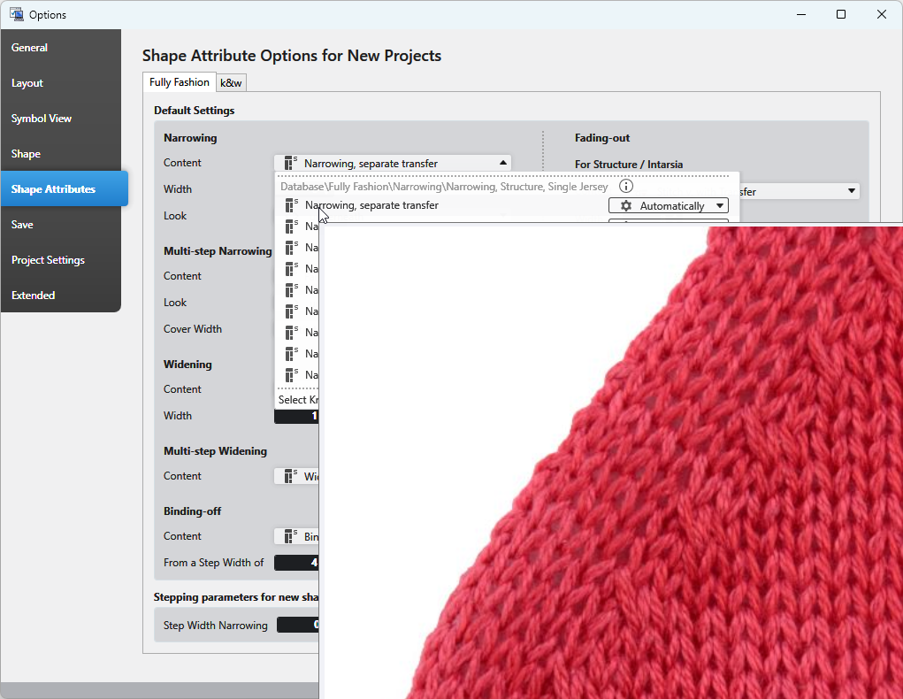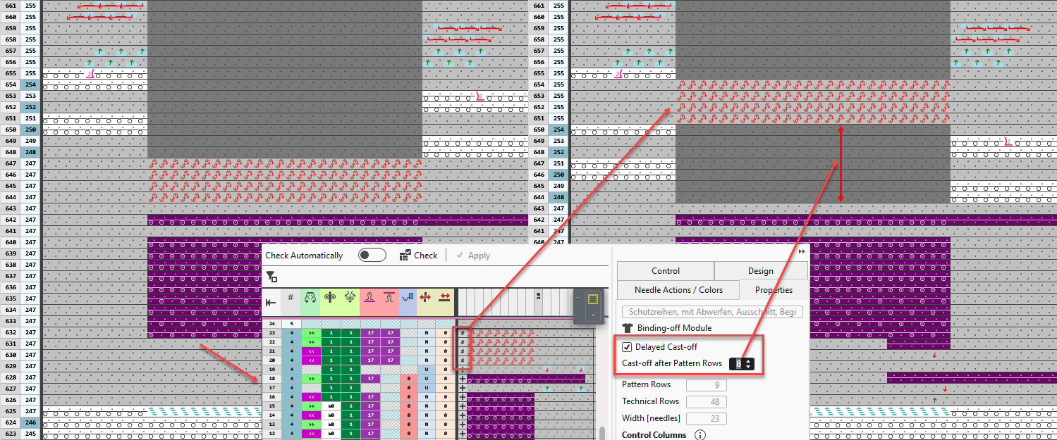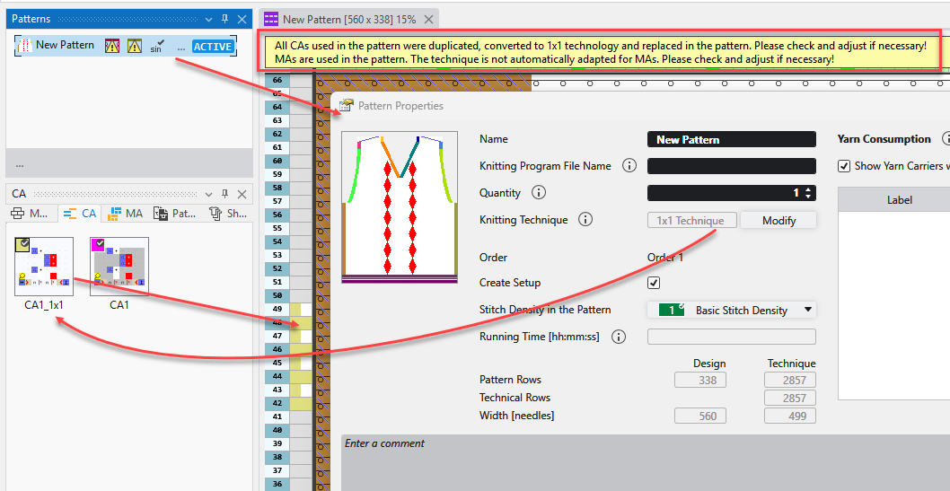 Changing the knitting technique in the pattern automatically replaces the CAs.