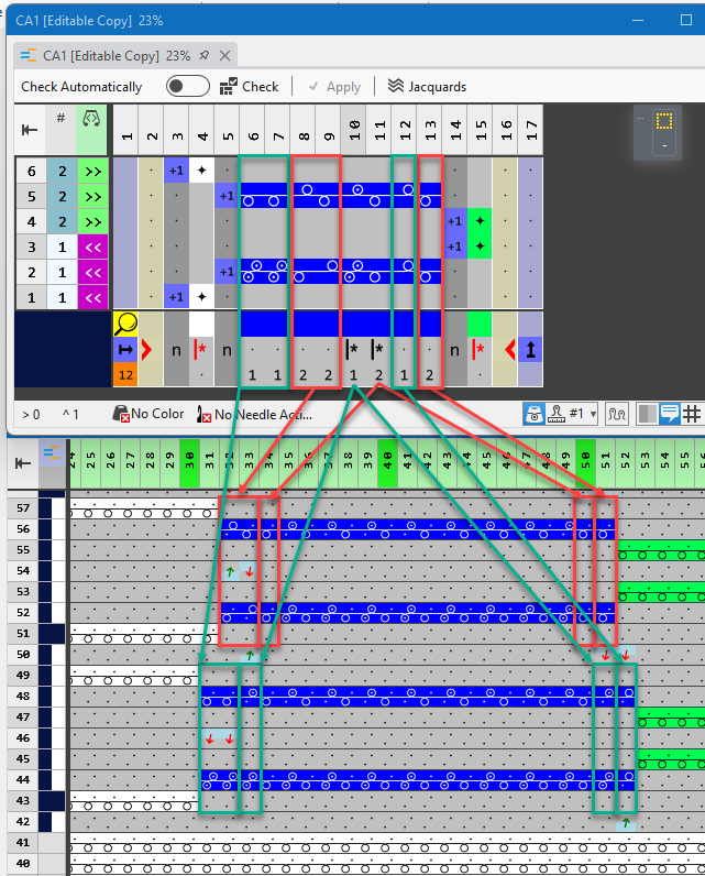 - All CAs used in the pattern are duplicated, adapted to the new knitting technique and replaced in the pattern.