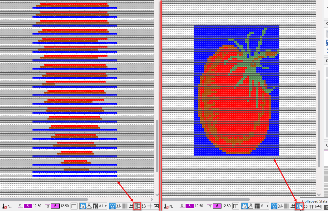 The hanging stitches are displayed in the pattern by yellow arrows if you click the warning.
