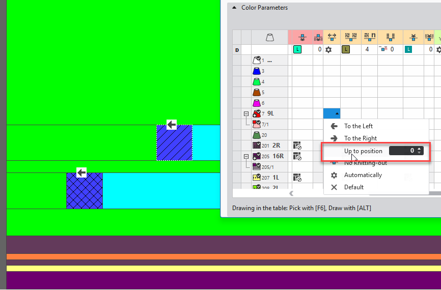 You can specify a knitting-out position of a yarn carrier in color parameters table.