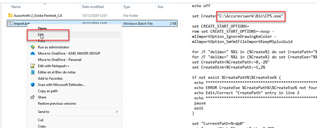 In die Import.bat Datei wird automatisch der Pfad zur CPS.exe eingetragen, sofern die CREATE auf dem M1plus-Rechner installiert ist.