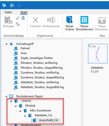 - Der Eintrag _import_ erscheint im STOLL Knit Explorer unter Strickelement-Depot.