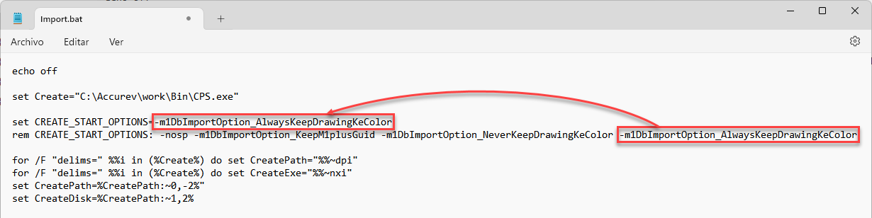 -m1DbImportOption_NeverKeepDrawingKeColorkopieren und hinterset CREATE_START_OPTIONS=einfügen.