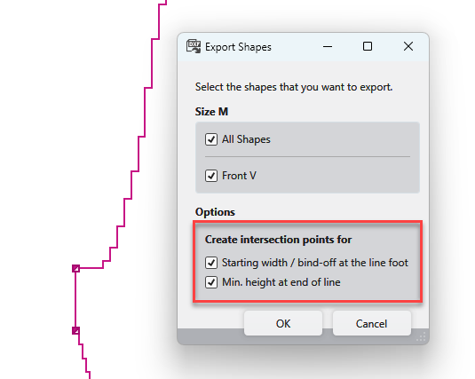 When exporting, new shape points can be created in the following dialog for the start width and the minimum height at the end of the line.
