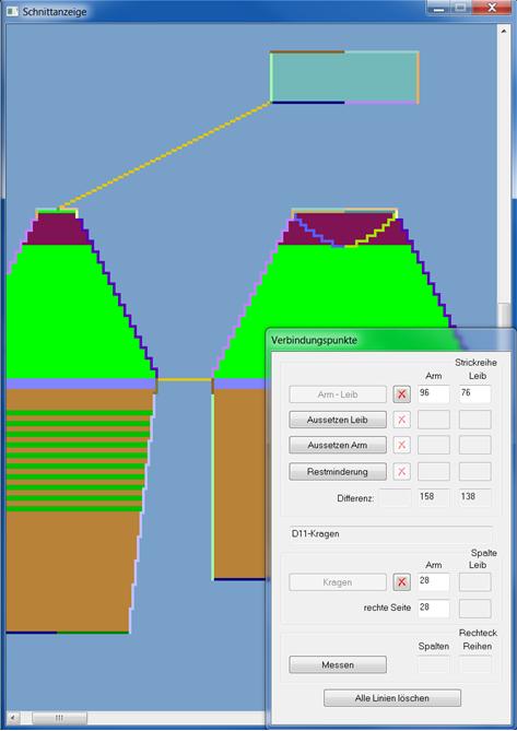 Zeigt die Differenz der Strickreihen zwischen dem Arm und Leib innerhalb der Formen |