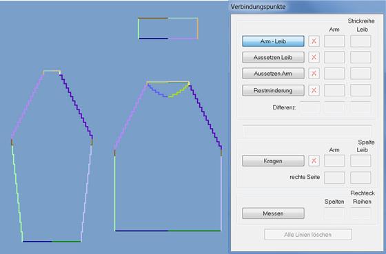 - Der Strickablauf für die Arm- Leibverbindung wird bis zur Verbindungslinie eingetragen.