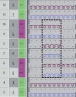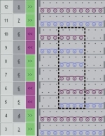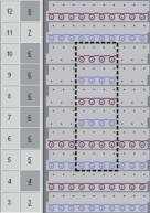 - Vertikale Farbbalken begrenzen die Strickreihe (= Selektionsende).