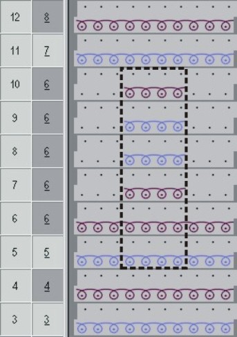 - Die Ein- oder Ausstrickreihe wird durch horizontale Farbbalken markiert.