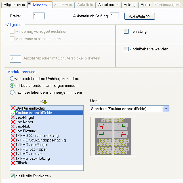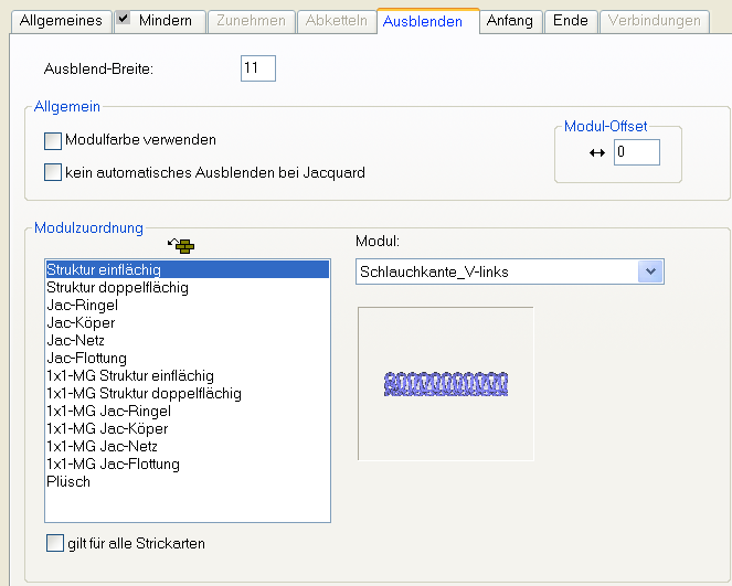 - Mit Drag&Drop der Strickart des Grundmotivs (Struktur einflächig) das erstellte Ausblendmodul Schlauchkante_V-links zuordnen.