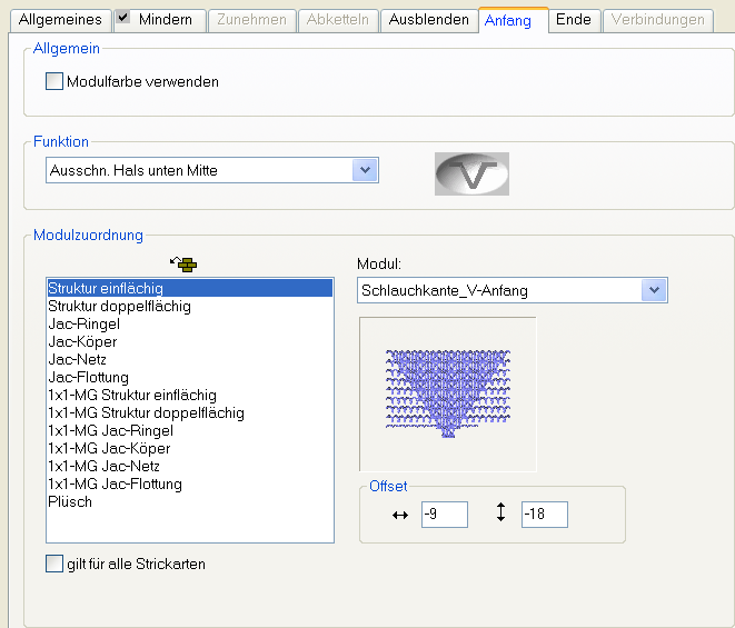 - Mit Drag&Drop der Strickart des Grundmotivs (Struktur einflächig) das erstellte Startmodul Schlauchkante_V-Anfang zuordnen.