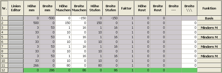 - Der ersten und letzten Minderung die Überdeckweite 1, alle anderen Minderungen die Überdeckweite 2 einstellen.