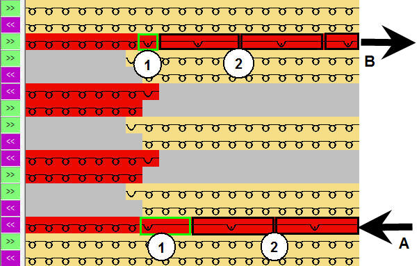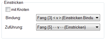 Ausgewähltes Modul Zuführen (Bsp. Fang {5} - - v - - ) wird vom Musterrand bis zu dem eingefügten Modul Bindung (Bsp. Fang {3} < v > mehrfach eingesetzt