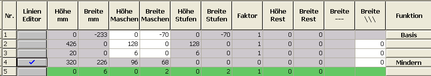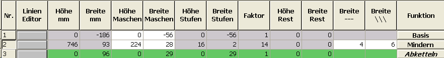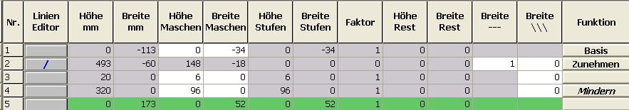 - Unter Linien links die Tabelle anlegen und die Werte für das Vorderteil eingeben.