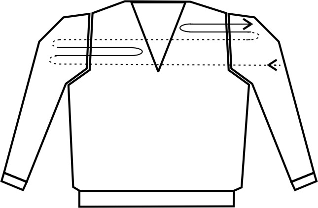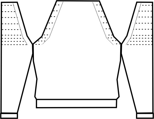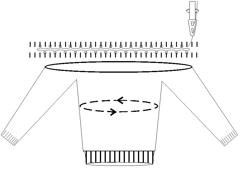 Die Einzelteile Leib und Arm werden schlauchartig gestrickt und durch Zunahme, Minderung und Abketteln in der Maschine zusammengefügt, so dass ein fertiges Bekleidungsstück entsteht.