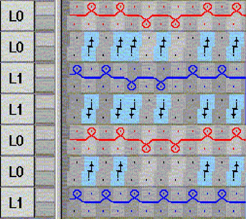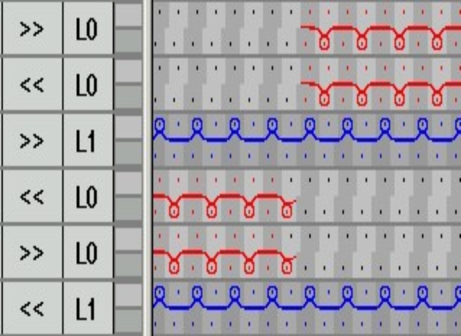 Bei der Mustererstellung werden die Umhängereihen beider Stricklagen (L0+L1) in eine Technikreihe zusammengefasst.